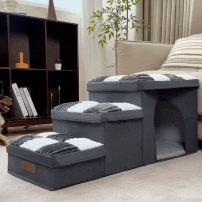 A chic set of dog stairs that doubles as a comfy mini-den and storage spot for toys lightweight, foldable, and perfect for small pets.